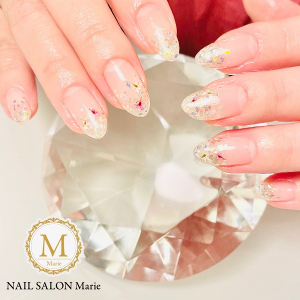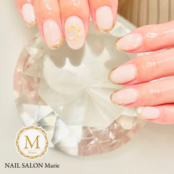 ニュアンスのフレンチにポイントで、タイダイ柄シェルを乗せました😊夏らしくて素敵です🍀