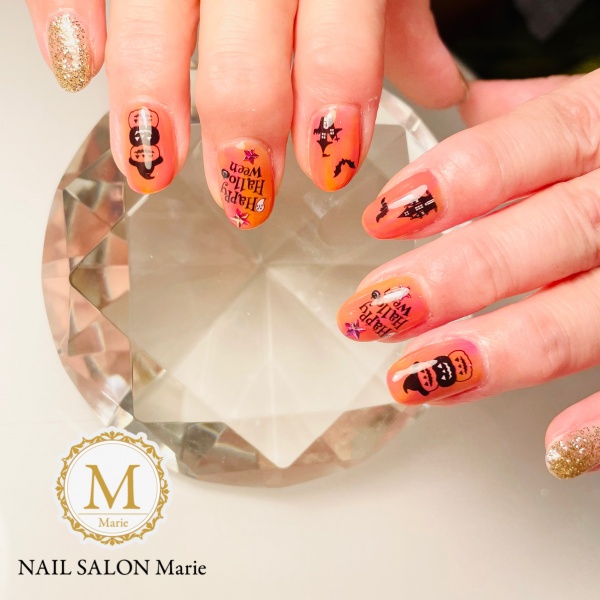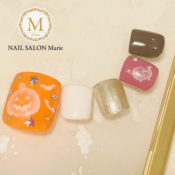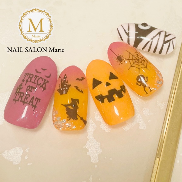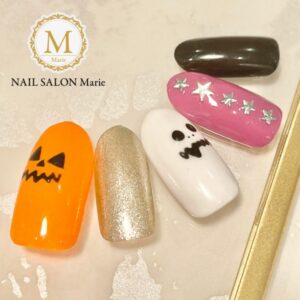 こんにちは✨今日はハロウィンネイルご紹介していきます🎃本日のお客様❣️指によってデザインをかえて、とっても可愛く仕上がりました✨