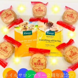 2周年記念として入浴剤とMarieクッキーのプレゼントがあります✨2月末までなのでこの機会に是非ご利用ください😆💓お一人様一個までです🍀数に限りがありますのでお早めにどうぞ💕